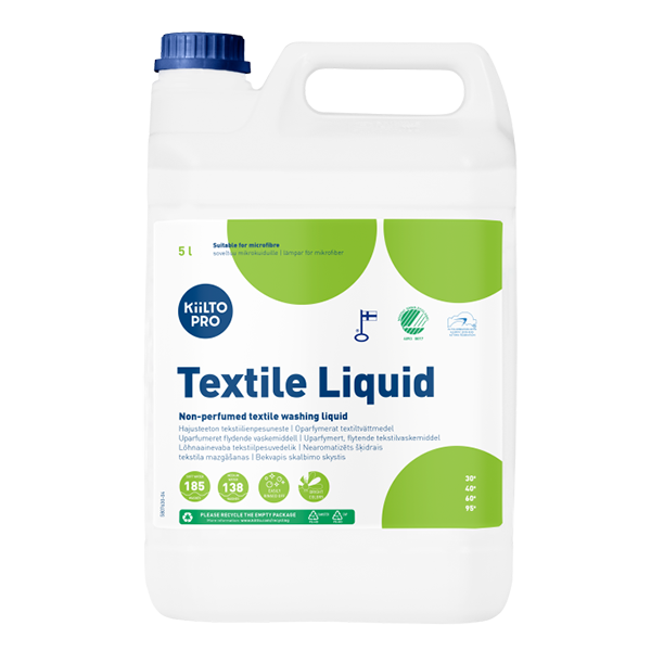 Den lavtskummende formel forbedrer vaskeeffektiviteten og er let at skylle af. Kiilto Pro Textile Liquid er også fri for fosfor, hvilket gør det muligt at opfylde endnu strengere miljøkriterier end dem, der er fastsat af det nordiske miljømærke Svanen.